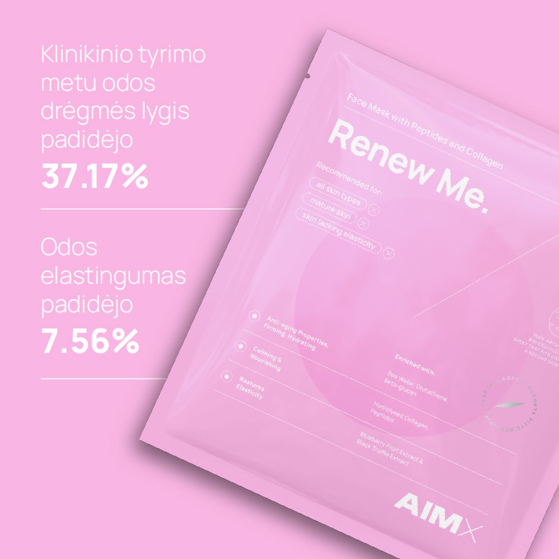 Renew Me – tai ne tik stangrinanti kaukė, bet ir efektyvi priemonė brandžios, jautrios ar nusilpusios odos priežiūrai. Įtraukite ją į savo rutiną ir mėgaukitės elastingesne, gaiviau atrodančia bei atsinaujinusia oda – tikslas pasiektas akimirksniu!